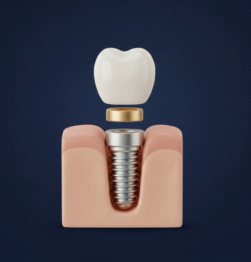 A dental implant consists of three precise components: a titanium post (placed in the jaw acting as a root substitute), an abutment (the connector), and a custom-made crown (the beautiful, visible tooth).